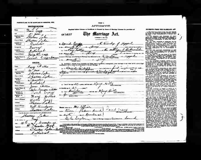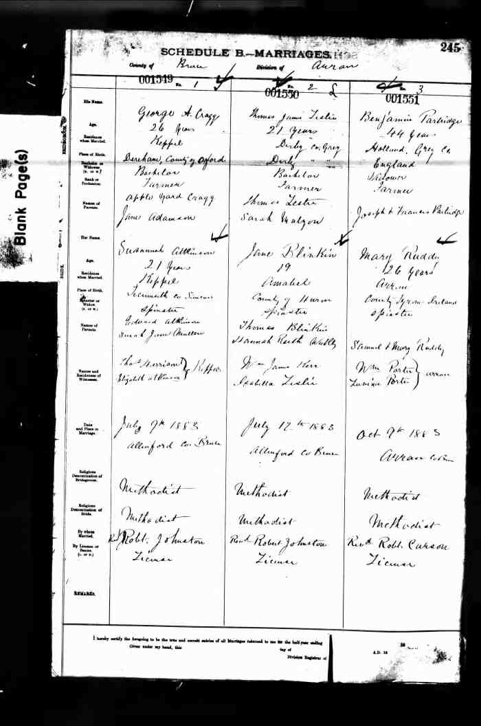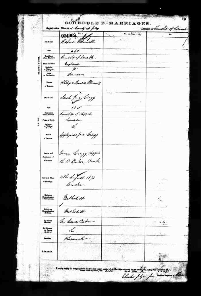 The birth place of their first child Mary Ann Cragg is inconsistently reported in census and death record as either England or Ontario. If Mary Ann was born in England it would not support her parents marriage in Ontario two years previously but if her parents married in Canada then Mary Ann's birth would likely have been in Ontario also.