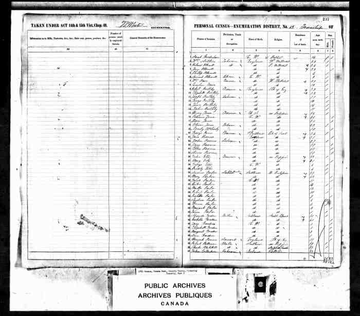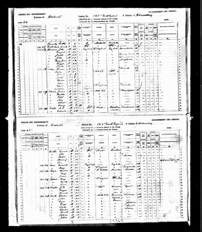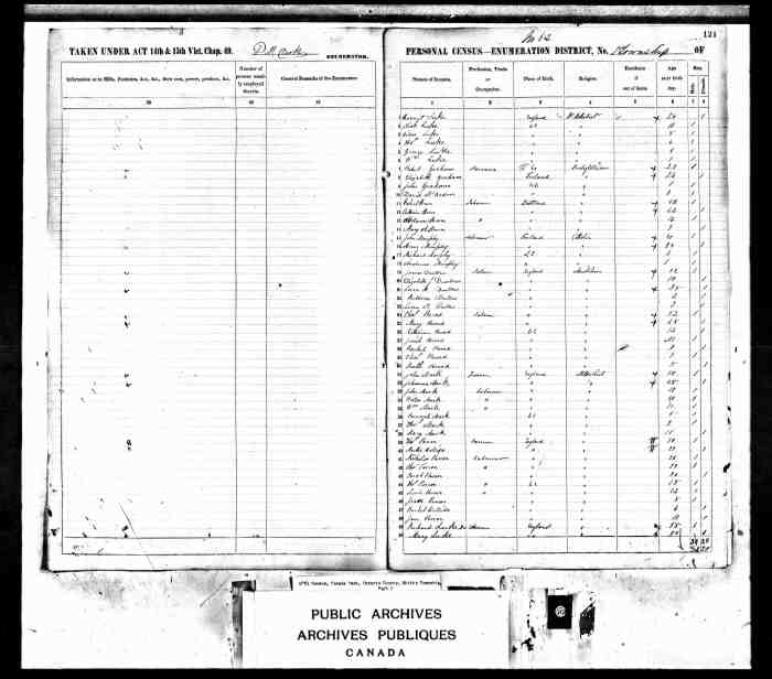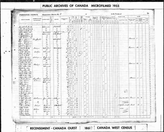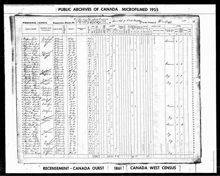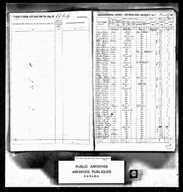 • Census: 1851, Dereham, Oxford County, Canada West (Ontario); Schedule: A; Roll: C_11745; Page: 11; Line: 10.