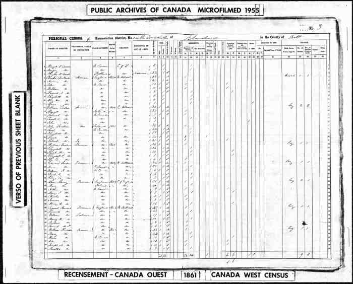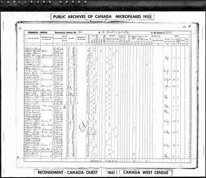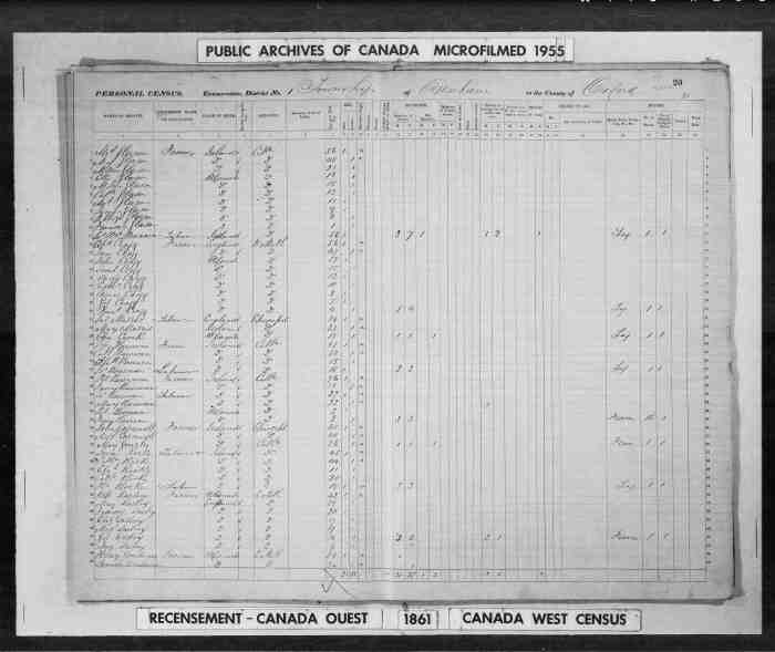 • Census: Scedule A, C-1060-1061, Pg 20, Line 12, 1861, Dereham Twp., Oxford Co., Canada West, Canada. 9 (Household Member)