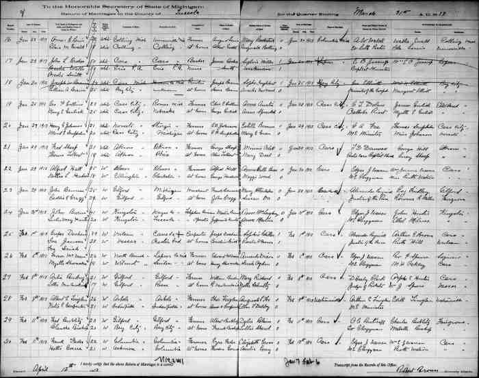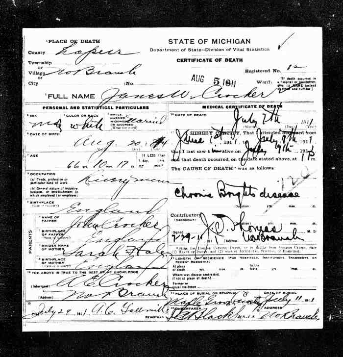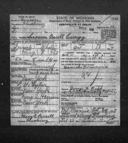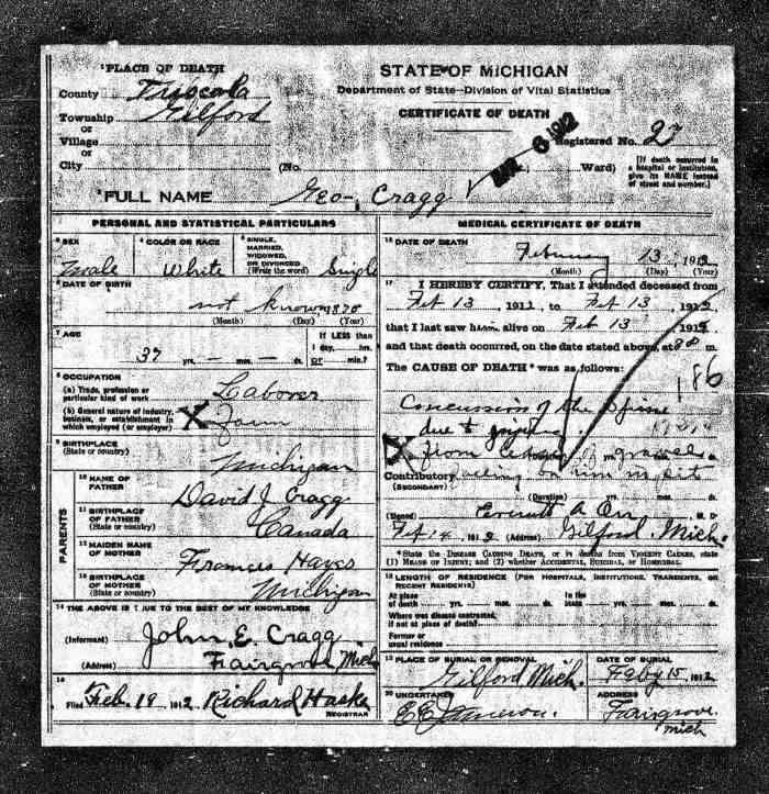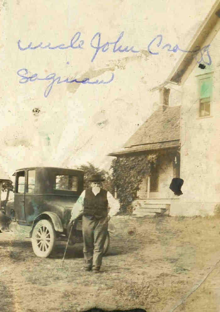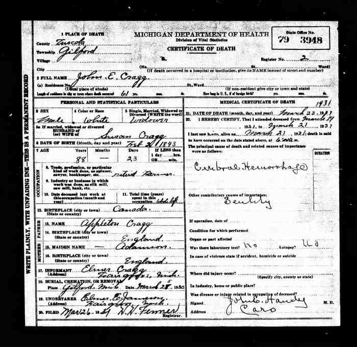 + 15 M iii. John Edward CRAGG was born on 28 Feb 1843 in Hope, Canada West (Ontario), Canada [as per tombstone & marriage register], was christened on 26 Apr 1844 in Newcastle by Rev W McFadden, Wesleyan Methodist Baptisms 528, died on 23 Mar 1931 in Gilford, Tuscola, Michigan, USA, Michigan, Death Records, 1867-1950, File #003948, Certificate: 79 3849 & [as per death Reg & tombstone]13 aged 88, and was buried in Mar 1931 in Gilford Cemetery, plot 29, Gilford, Tuscola, Michigan, USA.14