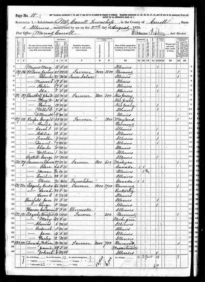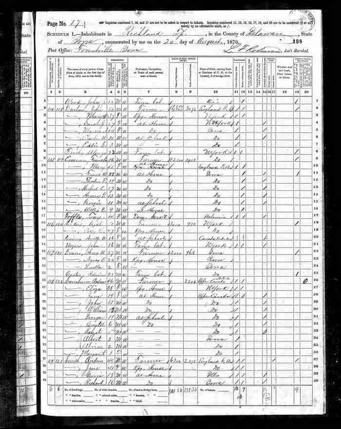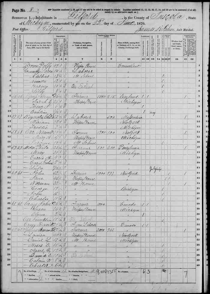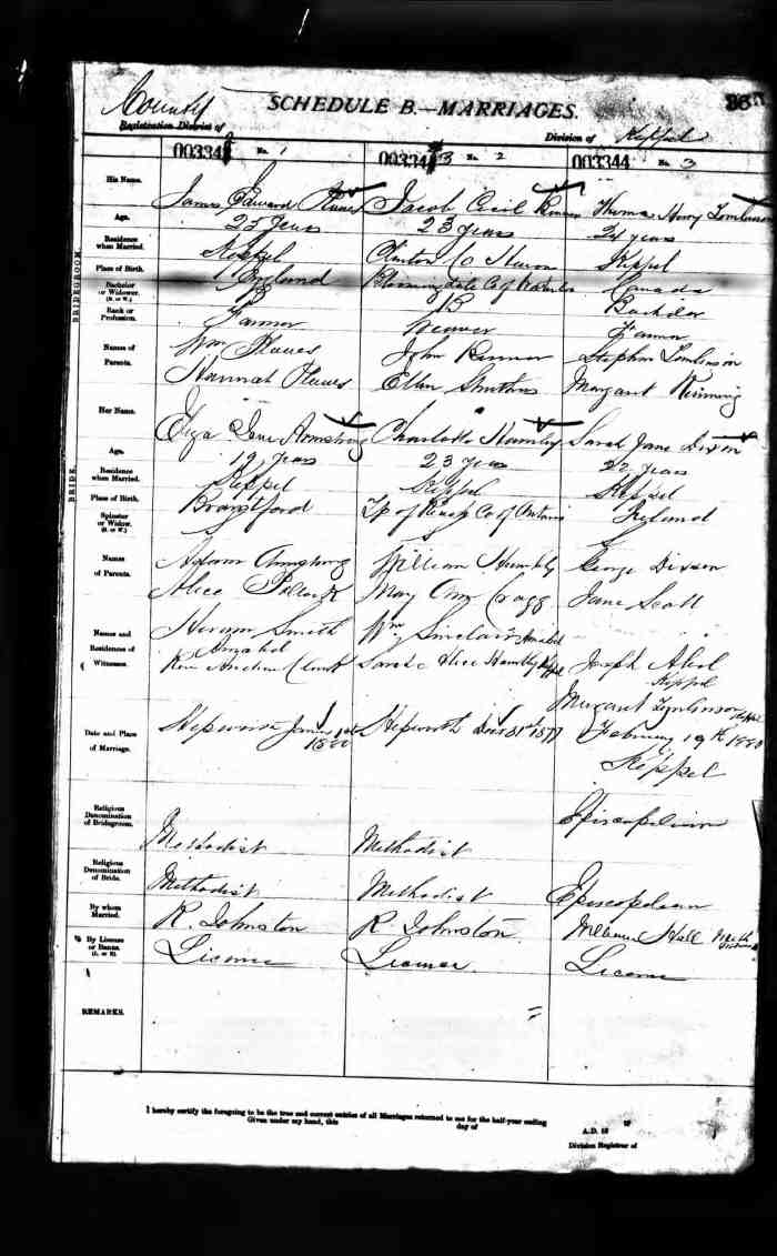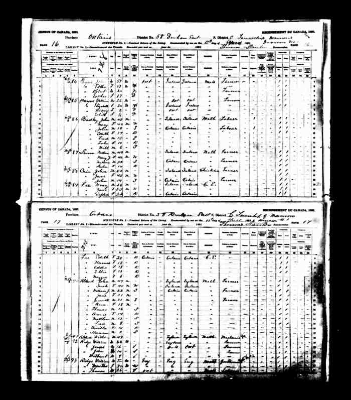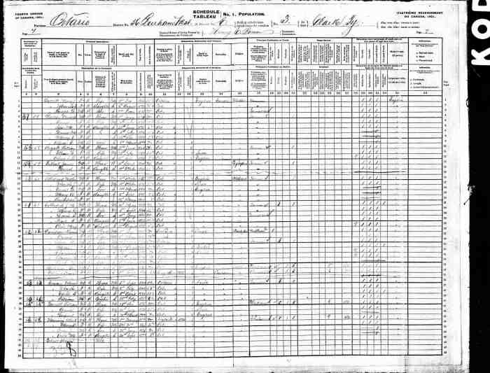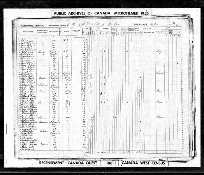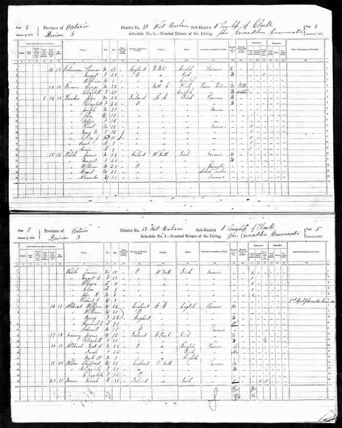 • Census: 1871, Clarke, Durham West, Ontario; Roll: C-9978; Page: 5; Family No: 17. Clarke, Durham West, Ontario; Roll: C-9978; Page: 5; Family No: 17