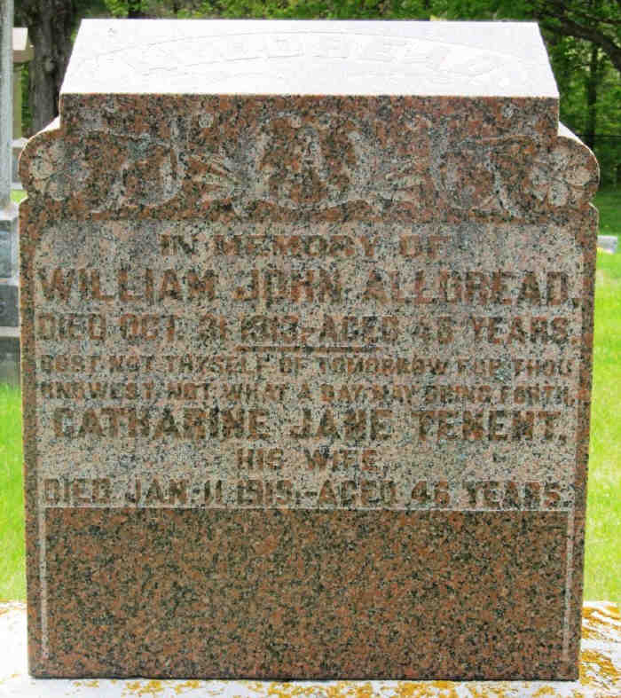 + 9 M i. William ALLDREAD was born on 3 Jul 1842 in Clarke, Durham, Ontario, Canada, [as per 1901 census] and died on 8 Jul 1910 in Lot 8, Concession 5, Manvers, Durham, Ontario, Canada, MS935, Reel 156, Pg. 283, #0224034 aged 68.