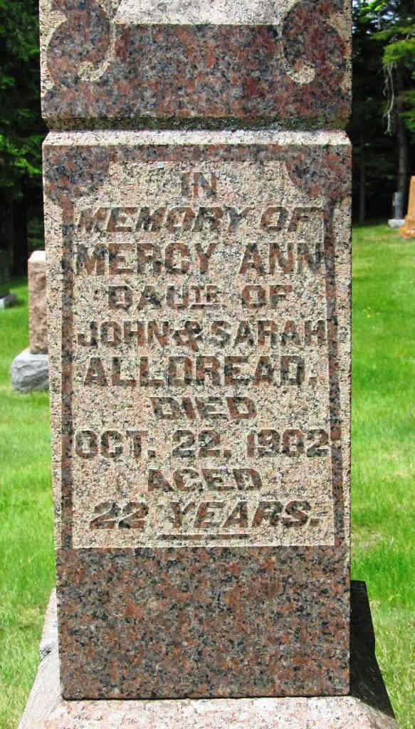 Mercy married William ALLDREAD. William was born in 1807 in Manchester, Lancashire, England, as per death registration and died on 2 Jan 1886 in Manvers Township, Durham County, Ontario, Canada, MS935; Reel: 44, Pg 669, #0126903 aged 79.