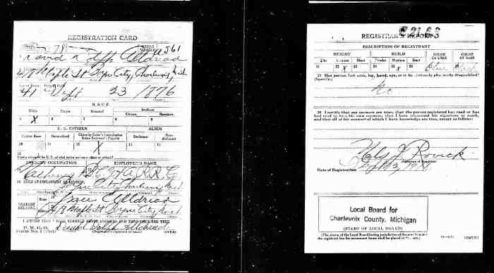 160. David Russell ALLDREAD was born on 18 Feb 1895 in Manvers, Durham, Ontario, Canada, MS929, Reel 127, Pg. ?, #022322203 and died on 9 Jul 1978 in Bowmanville, Durham, Ontario, Canada aged 83.