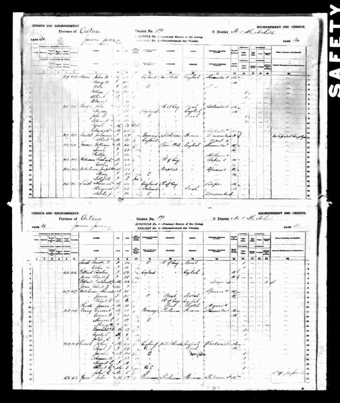 • Census: 1881, Manvers, Durham East, Ontario; Roll: C_13241; Page: 46; Family No: 217. (Household Member)
