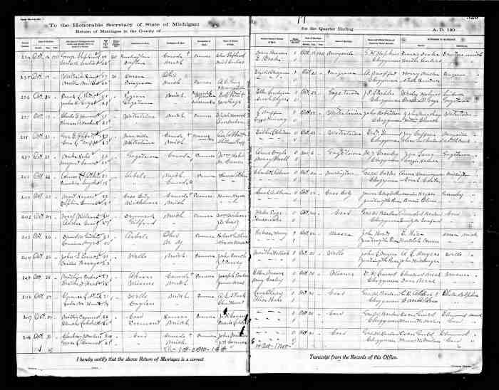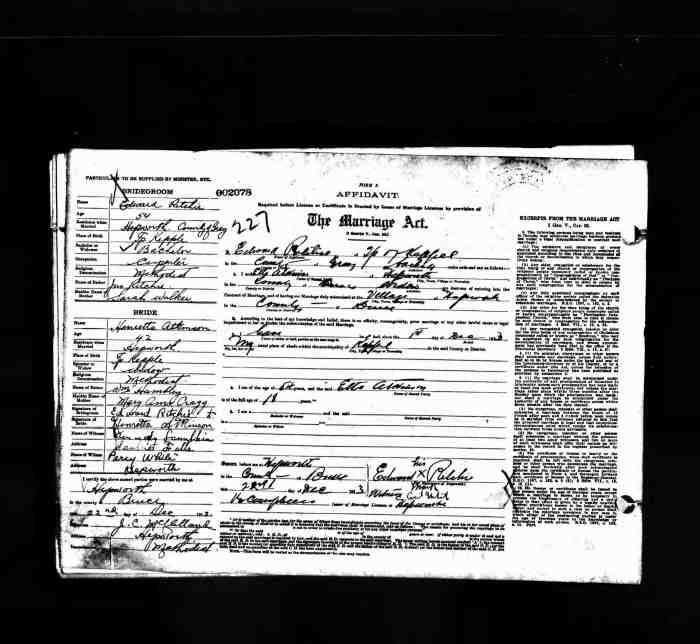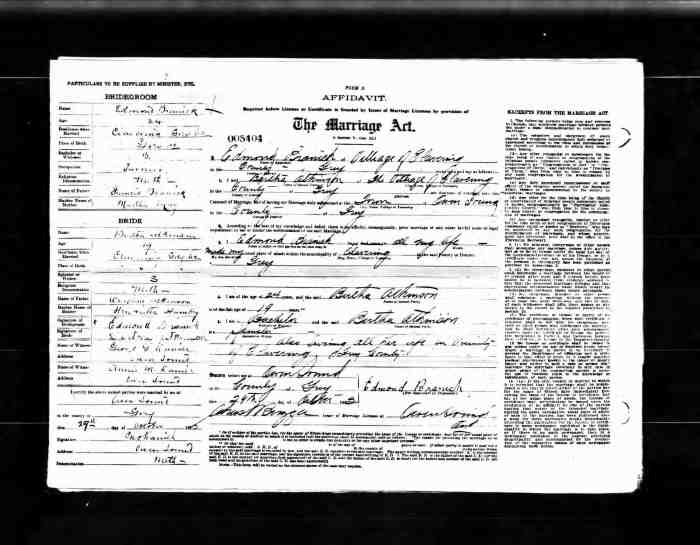 Marriage Notes: Date of Return, 21 January 1909, could be actual marriage date witn 16 Dec 1908 as the date of the issuing of the marriage licence.