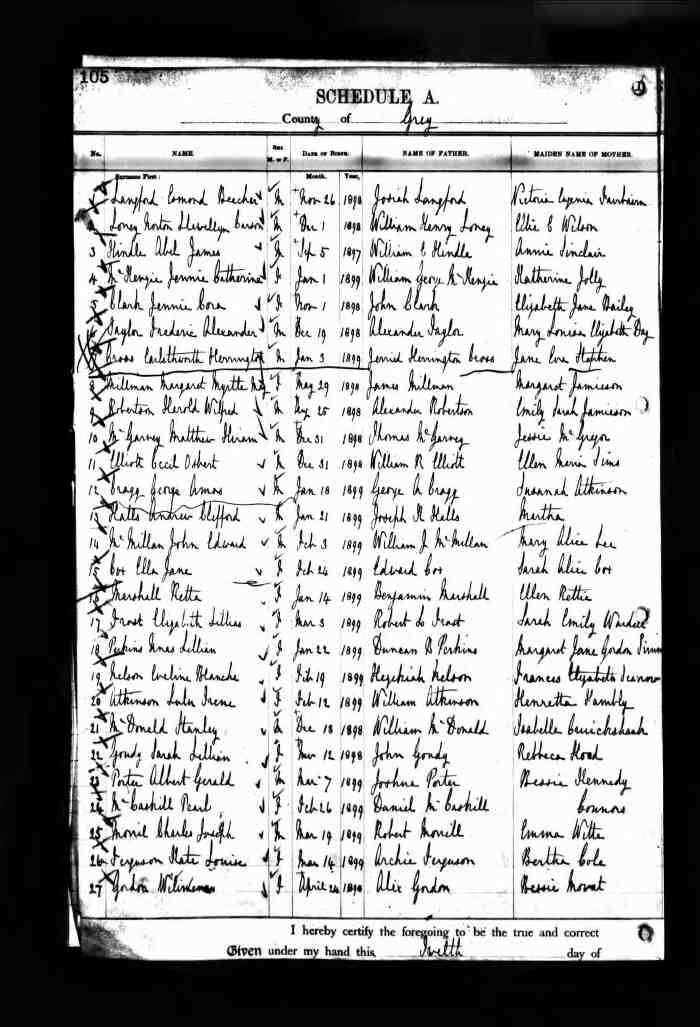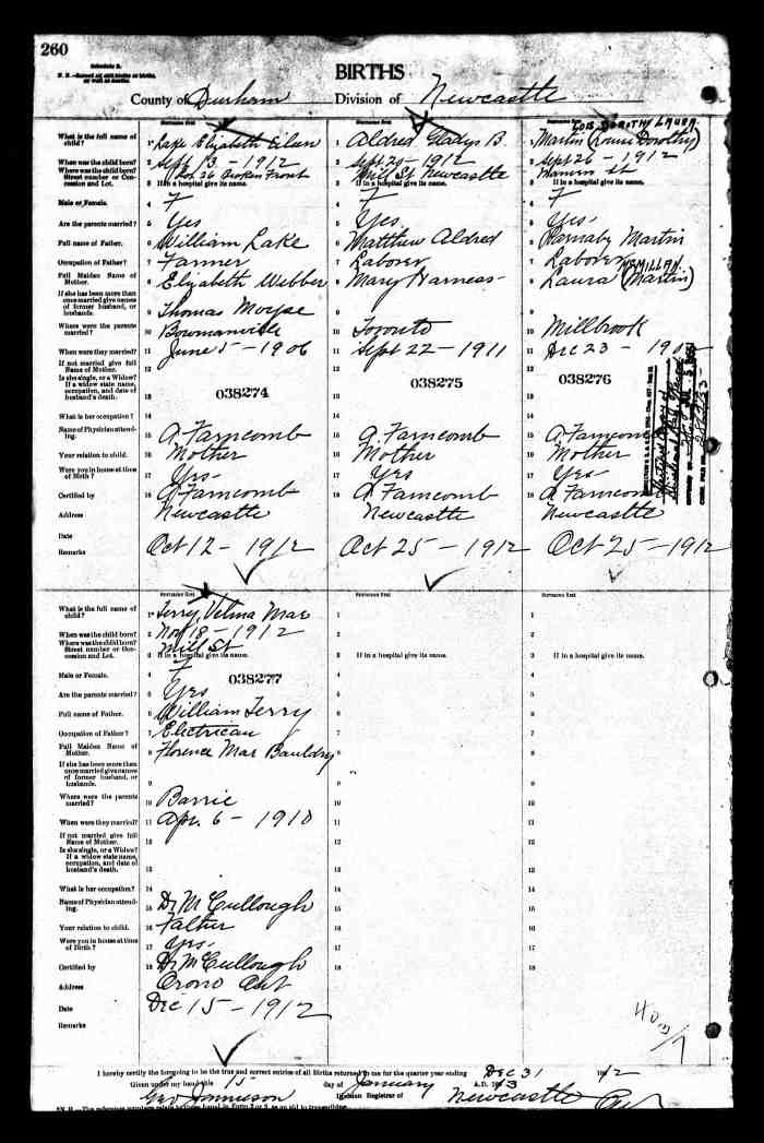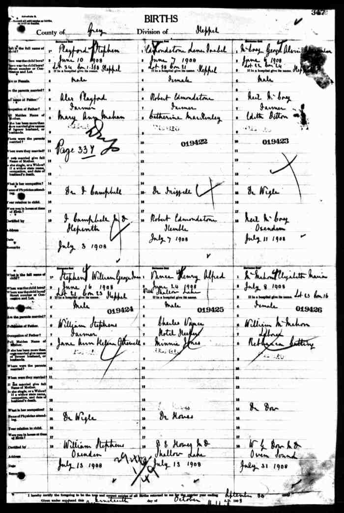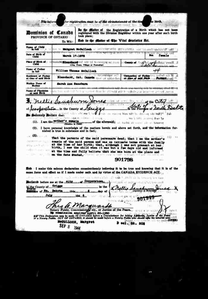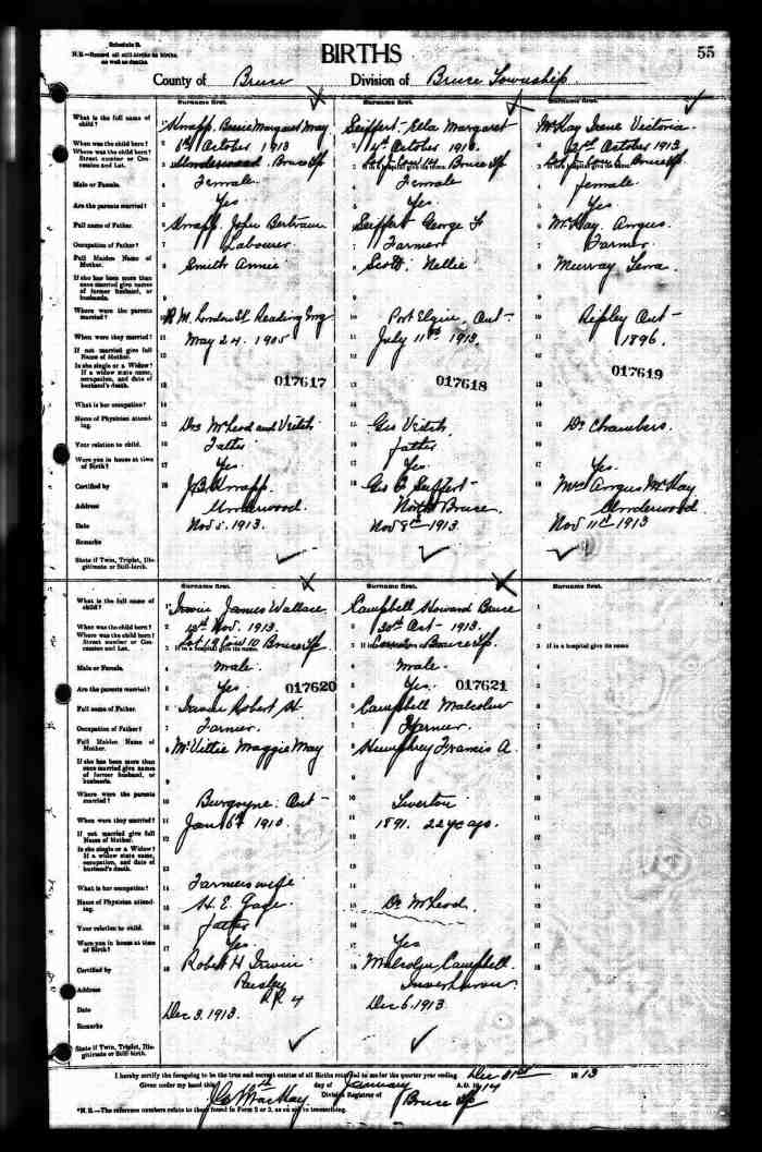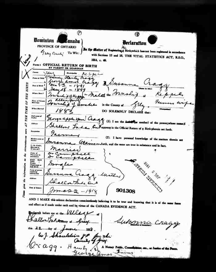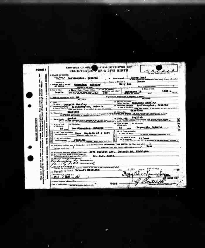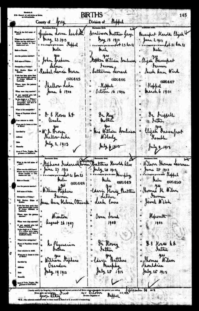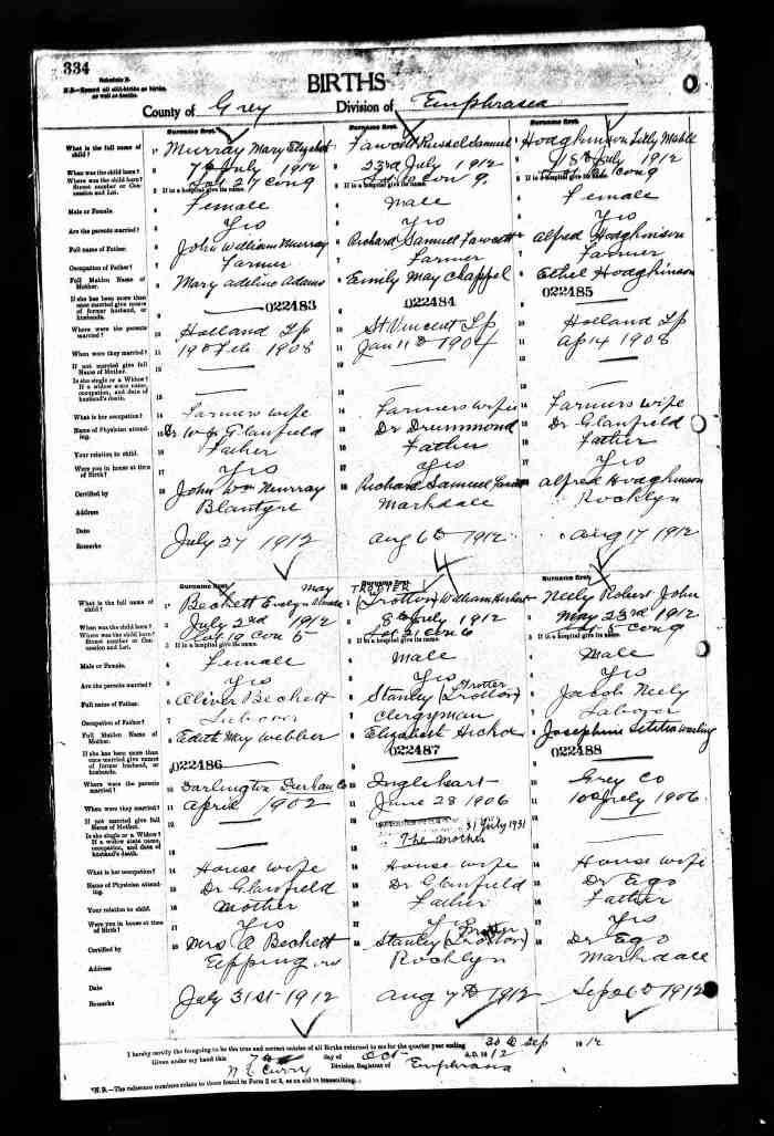 • Birth: 2 Jul 1912, Grey, Ontario, Canada, MS929, Reel 226, Pg. 334, #022486.