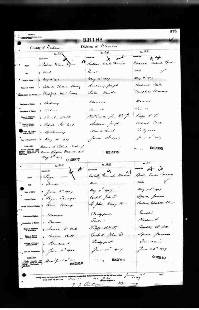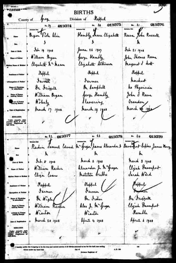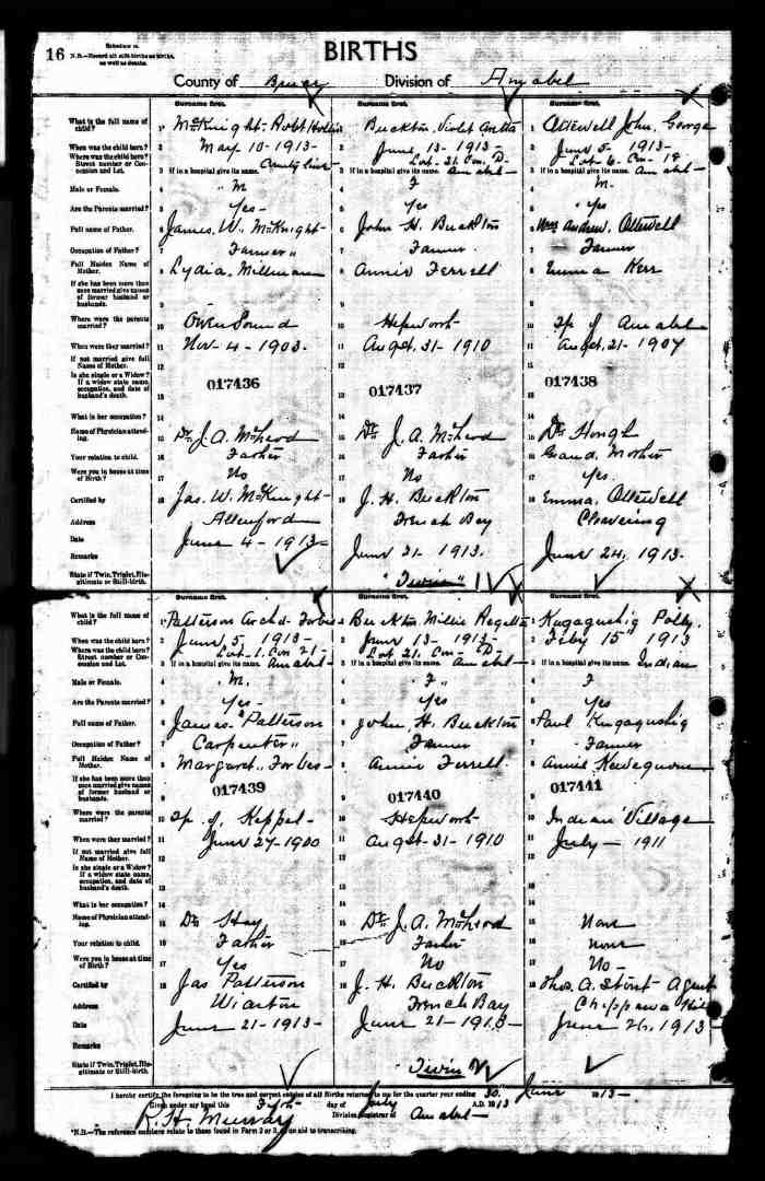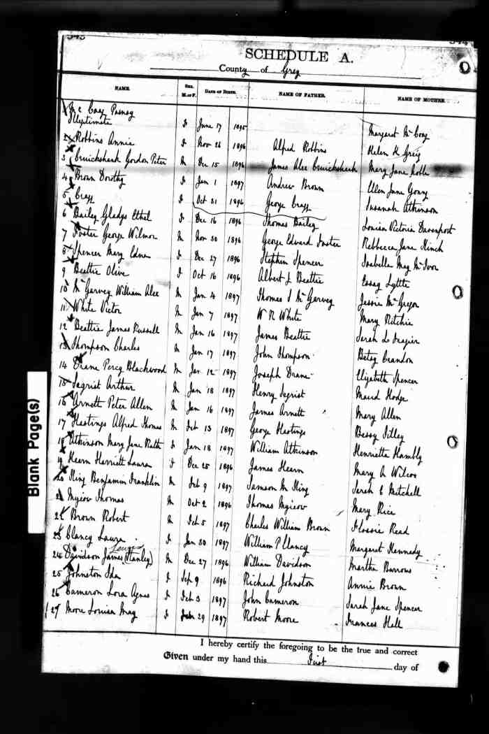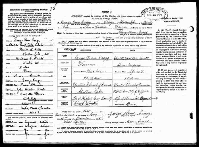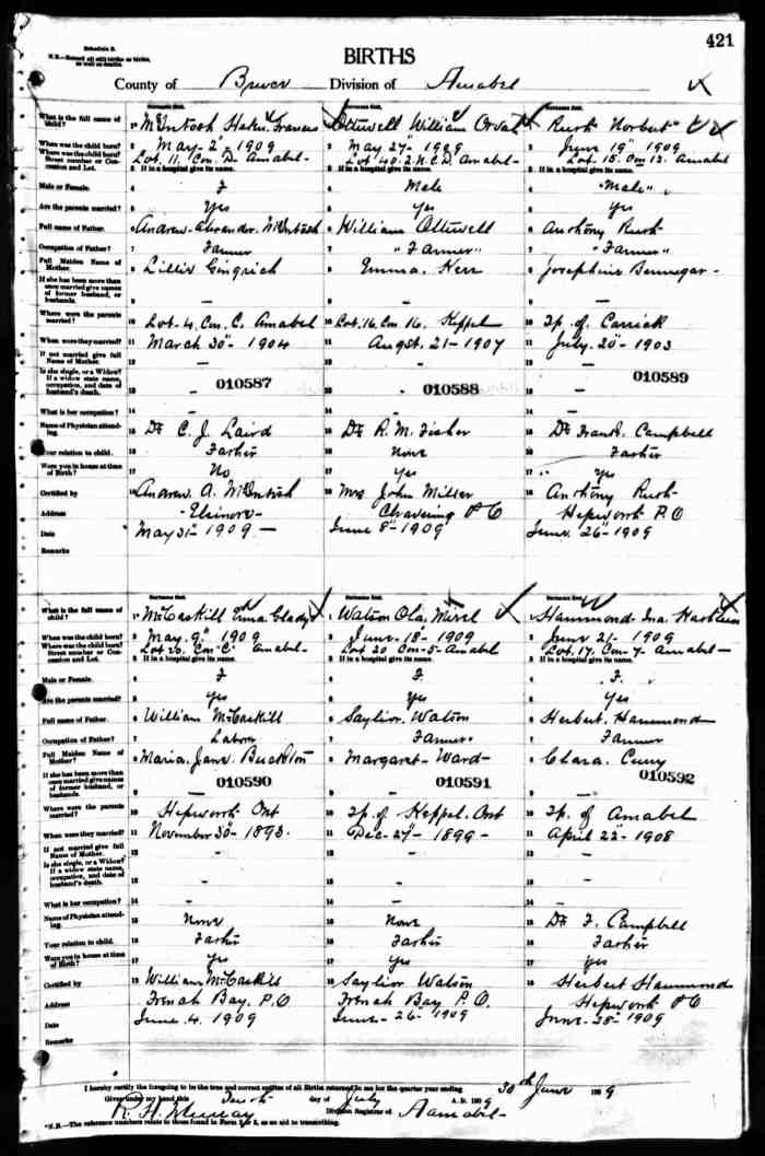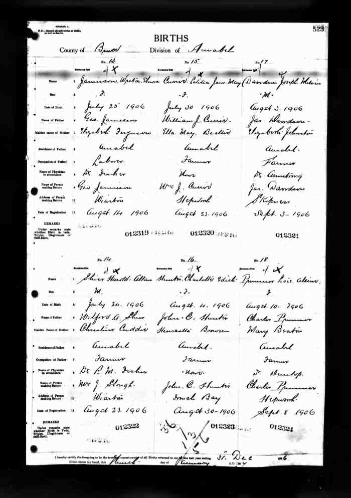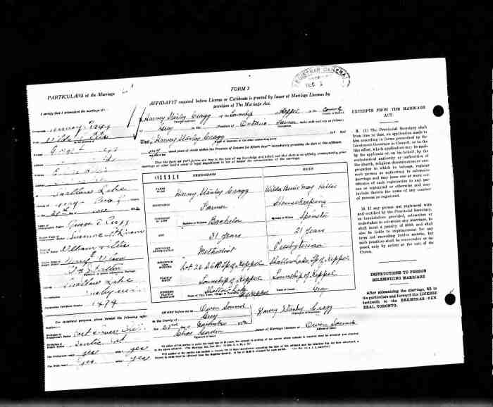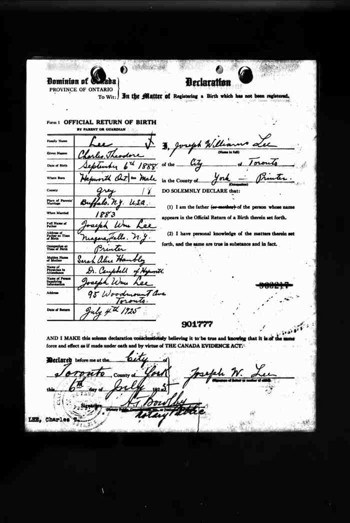 • Birth: 2 Jul 1912, Grey, Ontario, Canada, MS929, Reel 226, Pg. 334, #022486.
