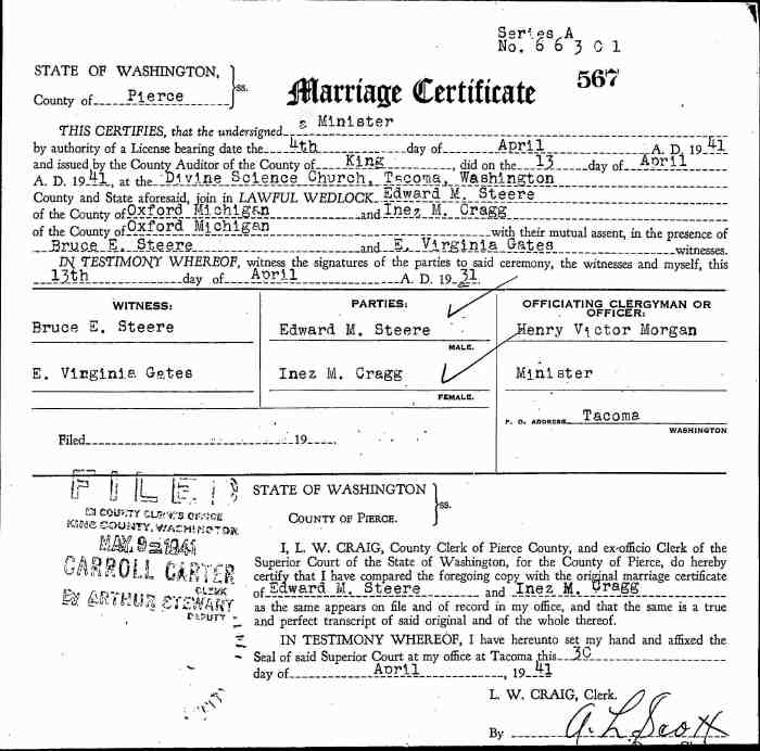 Marvin married Evelyn Almeda May BECKETT on 8 Jun 1949. Evelyn was born on 2 Jul 1912 in Grey, Ontario, Canada, MS929, Reel 226, Pg. 334, #022486 and died on 8 Apr 1987 aged 74.