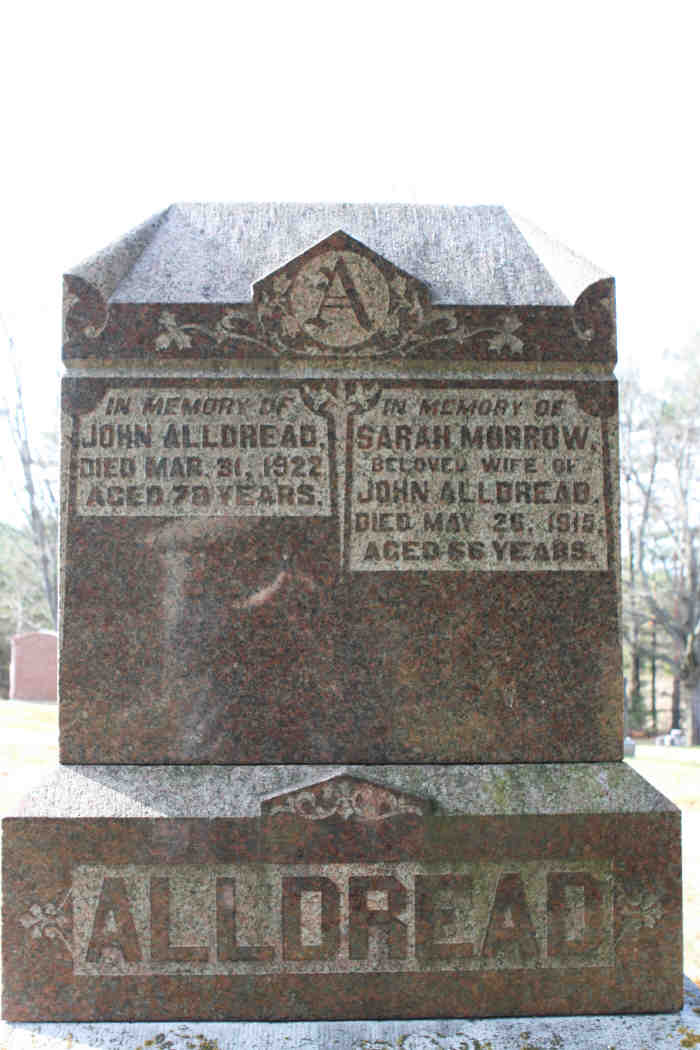 + 10 M ii. John Adamson ALLDREAD was born on 3 Sep 1843 in Clarke Township, Durham County, Ontario, Canada, Wesleyan Methodist Baptism, Vol. 3, Pg. 602, was christened on 19 Nov 1865 in Clarke, Durham, Ontario, Canada, Wesleyan Methodist Baptism, Vol. 3, Pg. 602, Rev. W. C. Washington, died on 31 Mar 1922 in Lot 8, Concession 3, Manvers, Durham, Ontario, Canada, MS935, Reel 291, Pg. 392, #0235895 aged 78, and was buried in Pontypool Cemetery, Manvers, Durham, Ontario, Canada.6