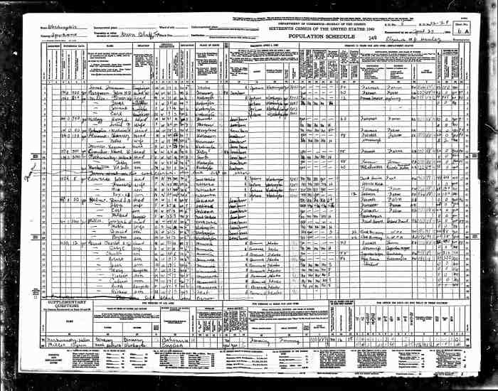• Census: 1940, Green Bluff, Spokane, Washington; Roll: T627_4362; Page: 6A; Enumeration District: 32-29.