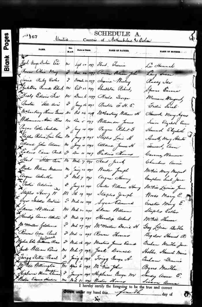 157. Sarah Jane ALLDREAD was born on 7 Sep 1890 in Manvers Township, Durham County, Ontario, Canada [as per 1901 census].