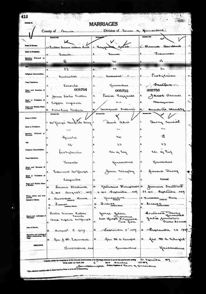 Sarah married James Henry SCOTT, son of James SCOTT and Catherine Ann McCREA, on 16 Dec 1908 in Oshawa, Ontario, Canada, MS932; Reel: 142, Pg. 35, #015776. James was born in 1879.