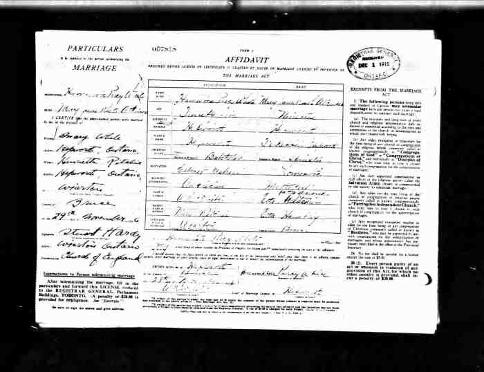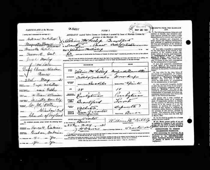 John married Lillian Mildred REID on 14 Nov 1917 in Durham, Ontario, Canada, MS932, Reel 426, #014059.358 Lillian was born in 1899 in Bailieboro, Durham, Ontario, Canada.