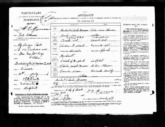 Marriage Notes: images.ourontario.ca/Partners/ClaPL/CLaPL002714374pf_0006.pdf General Notes: Pauline Alldread-Hodgson 165. Clarence Thomas Gordon ALLDREAD was born on 1 Aug 1904 in Northumberland & Durham, Ontario, Canada, MS929; Reel: 169, Pg 367, Line 7, #029458,211 died in May 1981 in Carman, Manitoba, Canada aged 76, and was buried in Greenwood Cemetery, Carmen, Manitoba, Canada, Row 25, Plot 11, Grave 5.