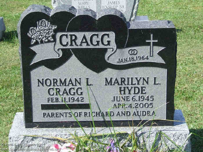 + 13 F i. Mary Ann CRAGG was born on 20 Apr 1833 in District One, Reach, Ontario, Canada [date as per 1901 census] but 24 Feb 1834 as of death record, died on 7 Sep 1909 in Hepworth, Bruce Co., Ontario, Canada, MS935; Reel: 143, Pg 167, #009259 aged 76, and was buried in Boyd Cem Shallow Lake Onatario Canada: Canada GenWeb Cemetery Project.12