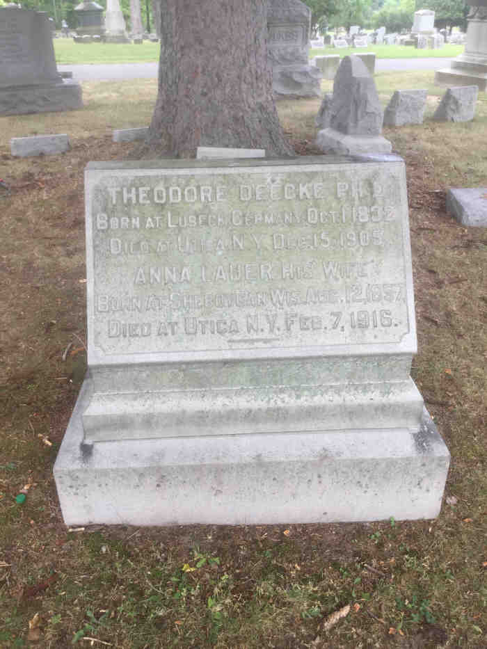 Anna married Theodore DEECKE Ph. D. Theodore was born on 1 Oct 1832 in Lubeck, Germany, died on 15 Dec 1905 in Utica, New York, USA aged 73, and was buried in Forest Hill Cemetery, Plot 43, Utica, Oneida County, New York, USA.