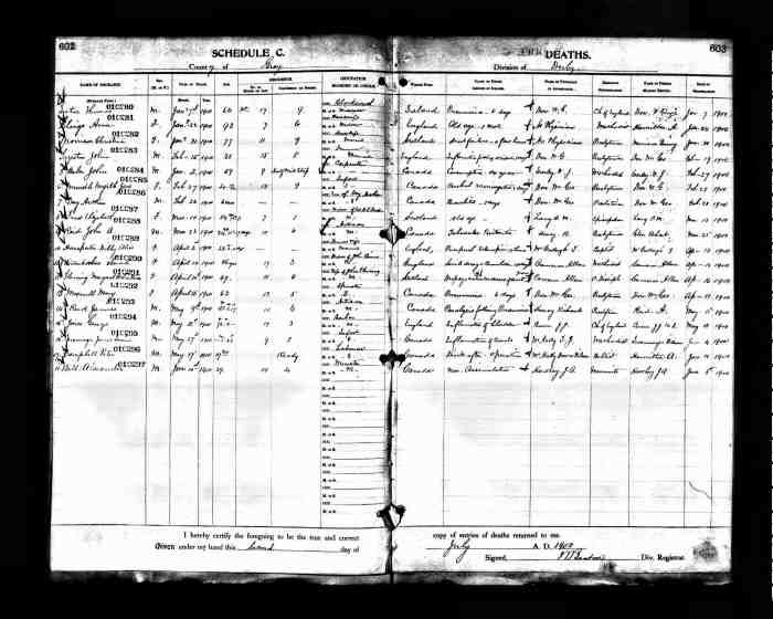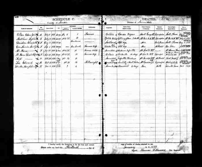 Death Notes: Death registrations notes that Edward Lee is her husband and that he was born in Reach, Ontario and is a millwright, Presbyterian