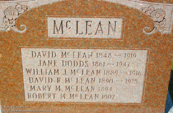 53. Canada Gen Web's Cemetery Project, Mount Pleasant Cemetery, digital images (http://geneofun.on.ca/cems/ON/ONGRY11036 : accessed 1 Dec 2015), Tombstone: David McLean, Jane Dodds, William J. McLean, David R. McLean, Mary M. McLean, Robert M. McLean.