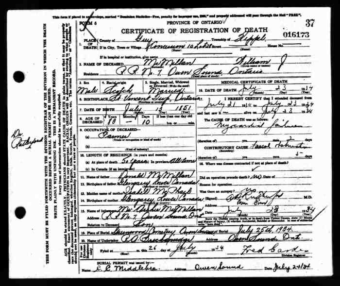 94. Ontario Archives of Ontario, MS 935, MS 940, MS 944, Reel: 486: Pg. 37, #016173, William J. McMillan; digital image, Provo, UT, USA: Ancestry.com Operations Inc, "MS935," Ancestry.com (http://ancestry.com: 23 Dec 2015).