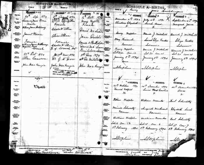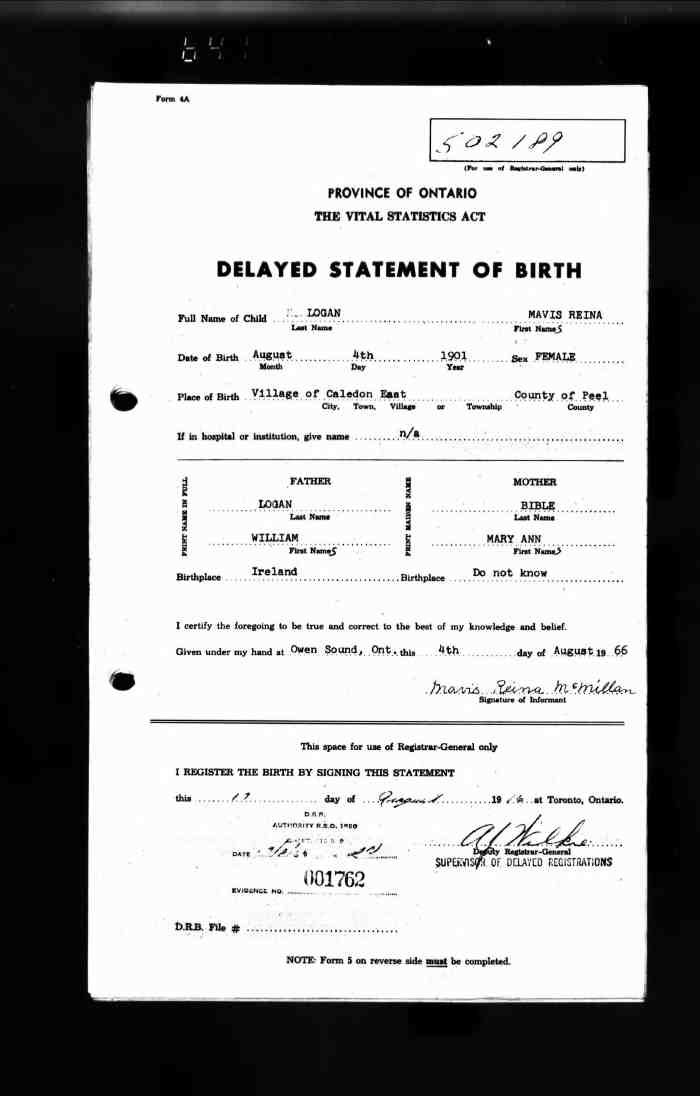 98. Ontario Archives of Ontario, MS 929, MS 930, MS 933, MS 936, MS 940, MS 946, Reel: 34: #502189, also #001762, Mavis Reina Logan; digital image, Provo, UT, USA: Ancestry.com Operations Inc, "MS930, Delayed registration," Ancestry.com (http://ancestry.com: 8 Dec 2015).