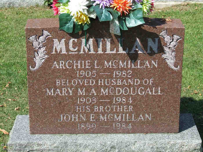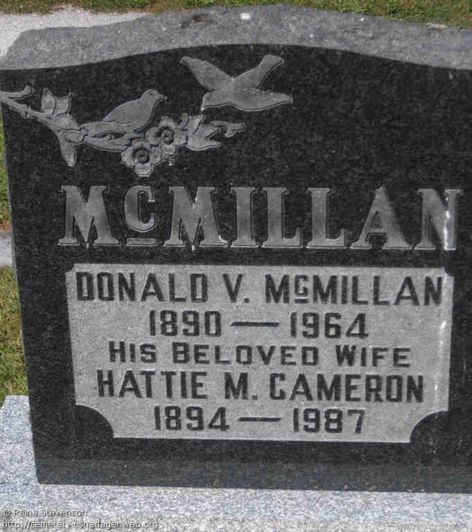 96. Canada Gen Web's Cemetery Project, Mount Pleasant Cemetery, digital images (http://geneofun.on.ca/cems/ON/ONGRY11036 : accessed 1 Dec 2015), Tombstone: Donald V. McMillan, & his wife, Hattie M. Cameron.